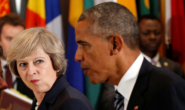 British Prime Minister Theresa May looks over toward President