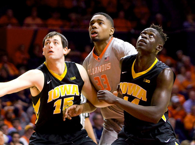 Iowa Hawkeyes forward Ryan Kriener (15) and guard Peter Jok (14) box