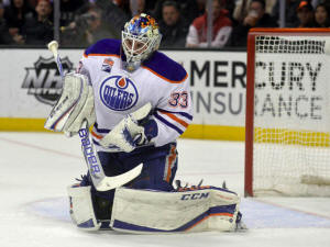 Oilers goalie Cam Talbot (33) blocks a shot against the Anaheim