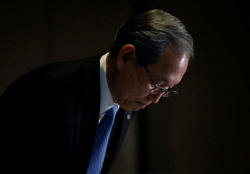 Toshiba Corp CEO Satoshi Tsunakawa bows during a news conference at