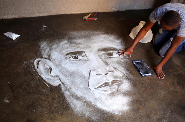 anymore," he said, crouching over his portrait of Obama on his