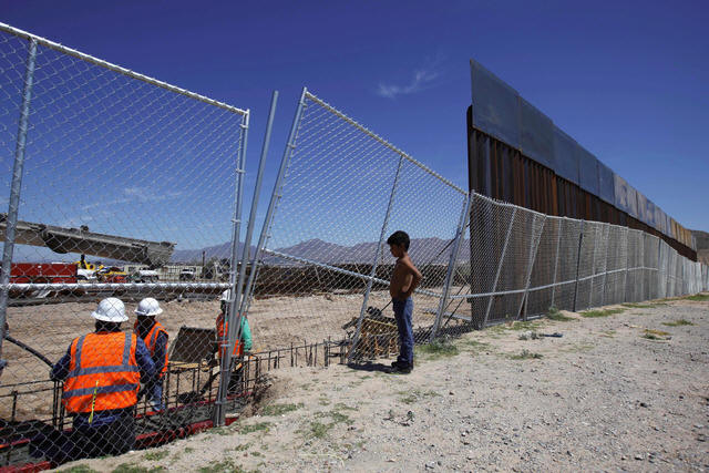 A boy looks at U.S. workers building a section of the U.S.-Mexico