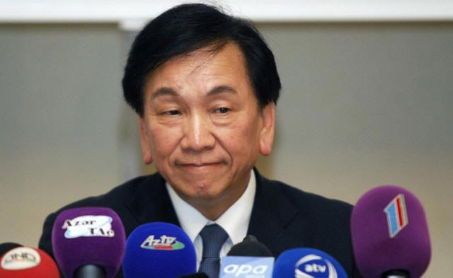 AIBA President Wu Ching-Kuo attends a news conference in Baku