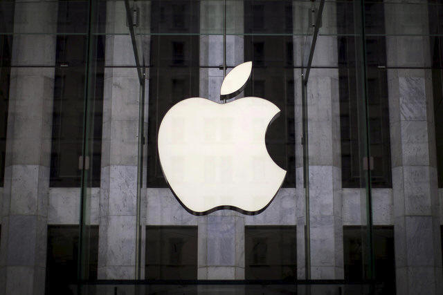 An Apple logo hangs above the entrance to the Apple store on 5th