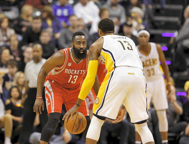 Rockets guard James Harden (13) guards Indiana Pacers forward Paul