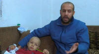 Jihad Alkhaled speaks to a reporter beside his son Mohammad,