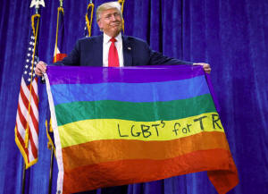 Republican presidential nominee Donald Trump holds up a rainbow flag