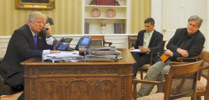 Bannon (R), speaks by phone with Australia's Prime Minister Malcolm