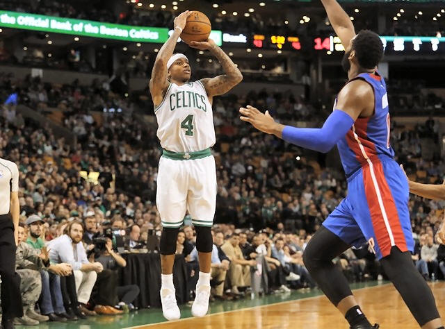 Celtics guard Isaiah Thomas (4) shoots over Detroit Pistons center