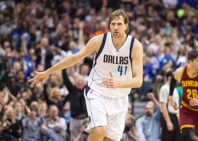 Mavericks forward Dirk Nowitzki (41) celebrates making a three point