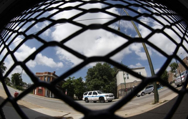 A Chicago Police vehicle patrols a neighborhood as it drives