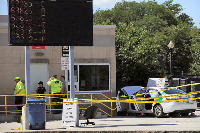 Yellow tape surrounds the scene where a taxi cab crashed into a
