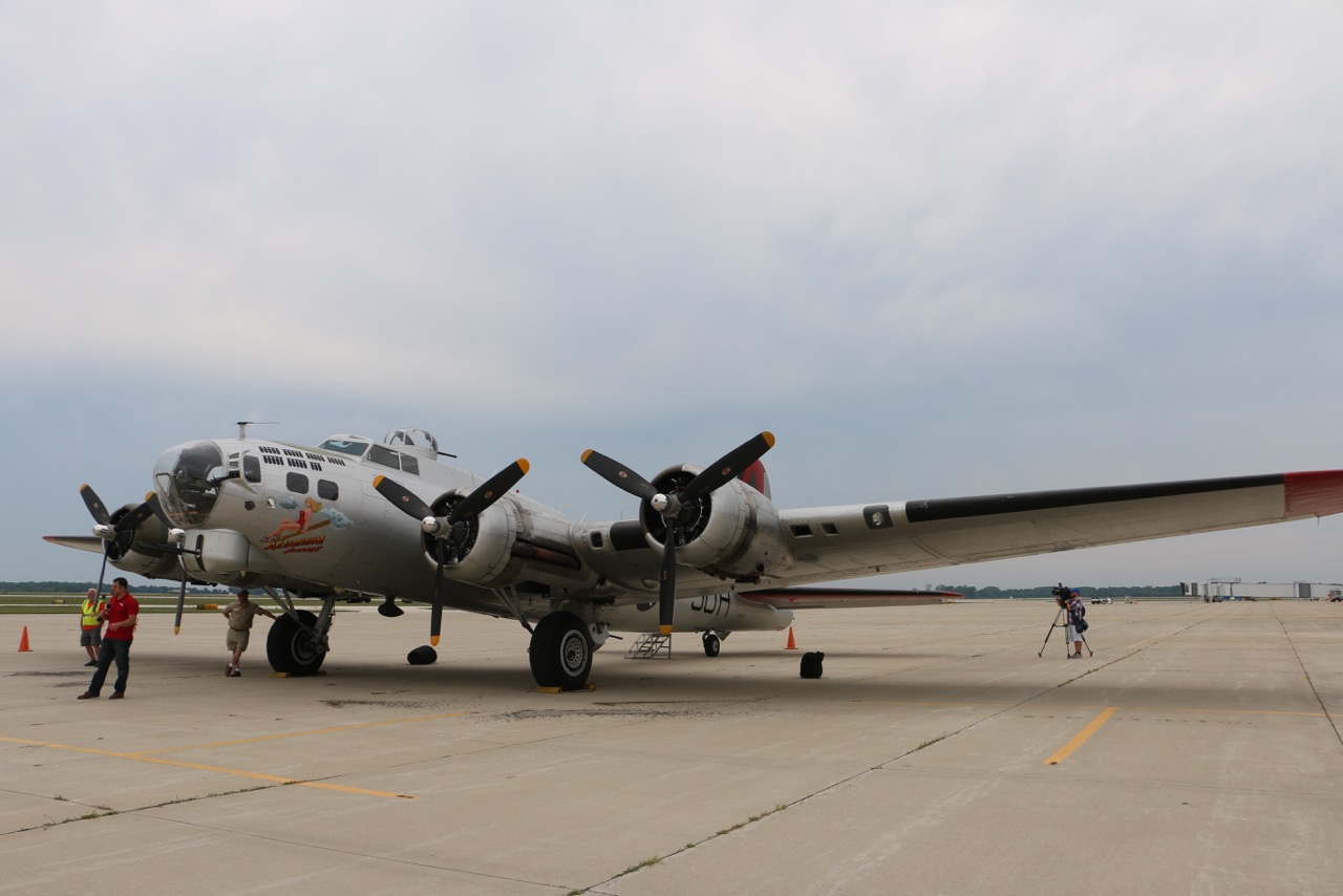 On a gorgeous afternoon at Abraham Lincoln Capital Airport on Thursday, June 29, 2017, a small crowd of eight media people gathered around the Aluminum Overcast as pilot Tom Ewing began to speak. “We are here to tell the story of the heroes that flew the B-17, he said. Ewing retired after 35 years flying for UPS and currently volunteers his time in the cockpit of the Aluminum Overcast.