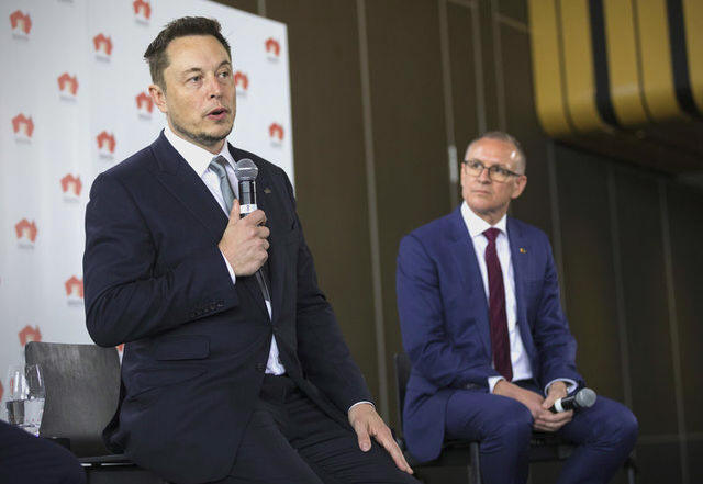South Australian Premier Jay Weatherill (R) listens to Tesla Chief