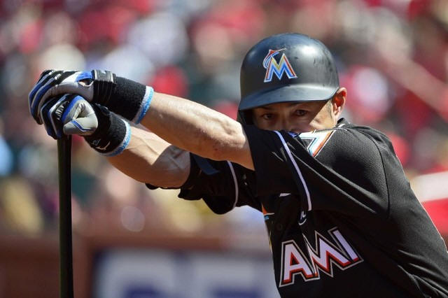 Marlins right fielder Ichiro Suzuki (51) looks on from the on deck