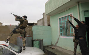 An Iraqi special forces soldier fires at a drone operated by Islamic
