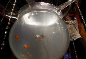 Japanese Art Aquarium artist Hidetomo Kimura puts goldfish in a tank