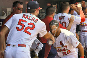 Cardinals left fielder Tommy Pham (28) has water splashed in his