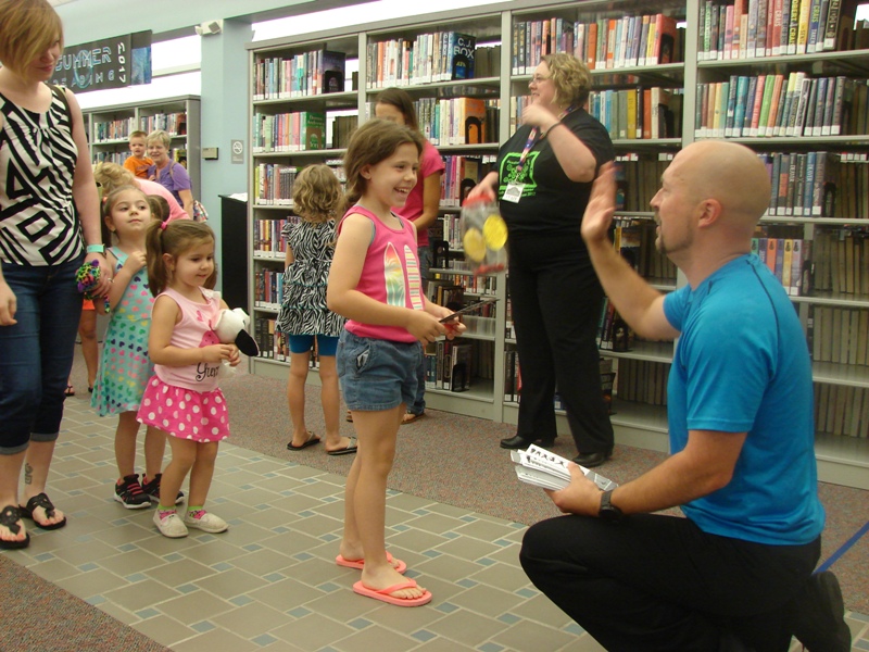 And then he gave every member of the audience a Juggling Jeff bookmark. “These are special bookmarks. You can transfer them from book to book and page to page and they still work,” he said. Kids and parents lined up for a bookmark and a high-five from Juggling Jeff.