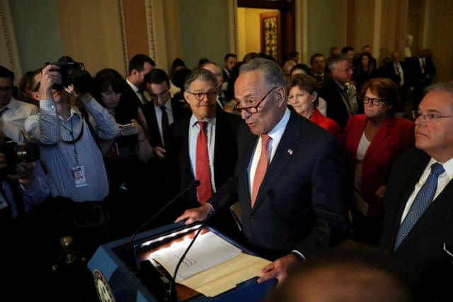 Leader Chuck Schumer (D-NY) speaks during a news conference