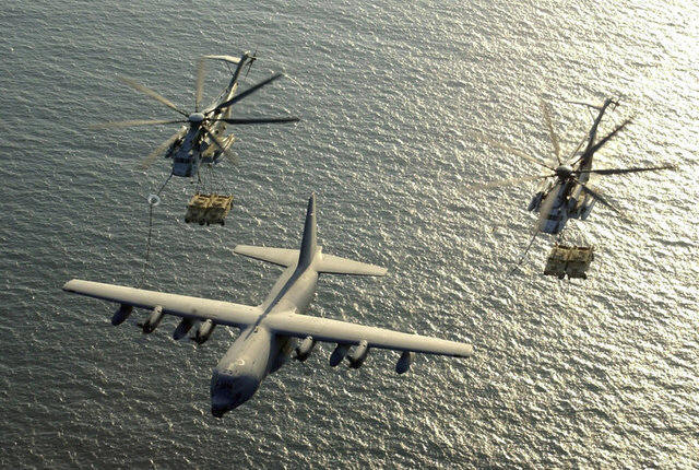 Two U.S. Marine Corps CH-53E Super Stallion helicopters receive