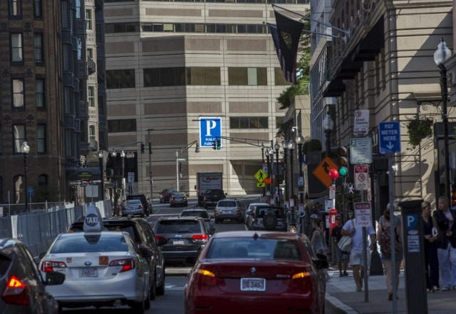Traffic fills Exeter Street in the Back Bay in Boston,