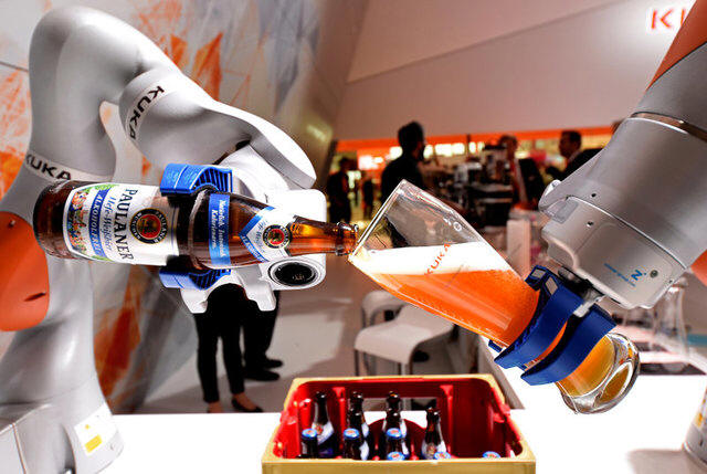 A robotic arm fills a glass with Bavarian Weiss beer at the booth of