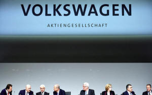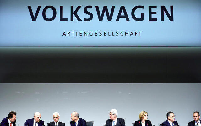Volkswagen CEO Matthias Mueller (3rd L) and Hans Dieter Poetsch,