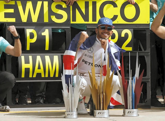 Mercedes' Lewis Hamilton celebrates with his team after winning the