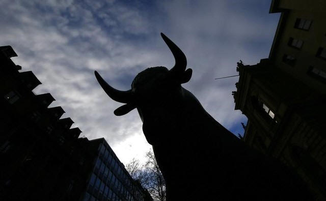 A bull, symbol of successful burse trading is silhouetted outside