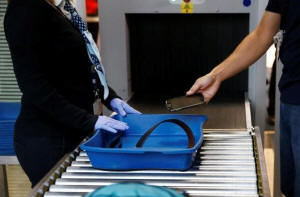 shoes, mobile phone and bags at the security gates at Cointrin