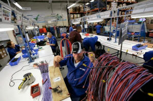 Employees work at a wire harness and cable assembly manufacturing