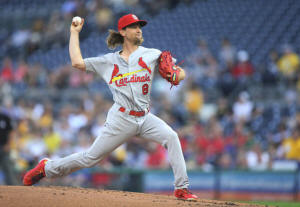 Cardinals starting pitcher Mike Leake (8) delivers a pitch against
