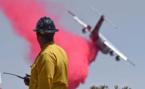 A firefighter watches as a BAe-146 makes a phos-chek drop along the