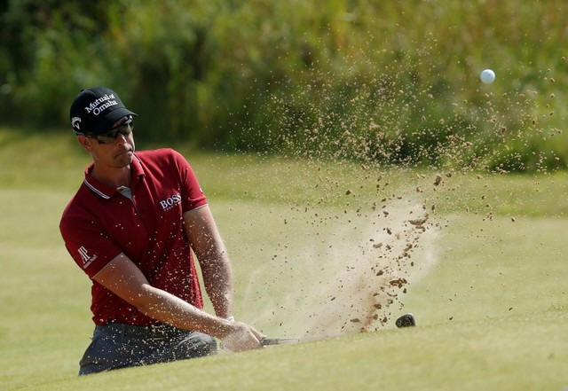 Sweden’s Henrik Stenson plays out of a bunker during a practice