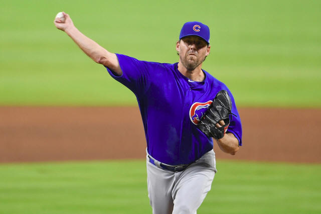 Cubs starting pitcher John Lackey (41) pitches against the Atlanta