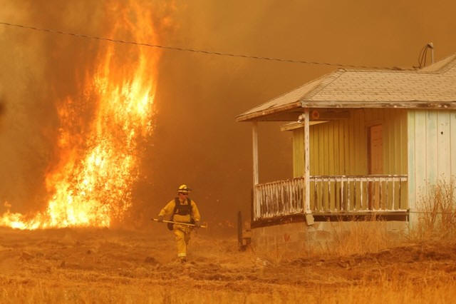 A firefighter walks near a home as flames from the fast-moving