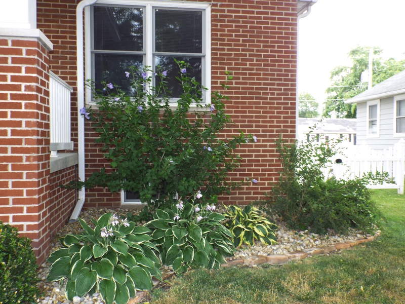 shrubs lining the footing of the house, and a lovely sitting area