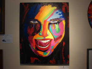 Moriearty specifically pointed to “Sass” by Phil Cooling. It hangs against the back wall and its vibrant colors, size, and theme draws the eye of the visitor as soon as they walk into the door. “We had to be careful with that one because it stands out. So, we chose paintings with similar colors and shapes within the painting to hang near it,” she said.