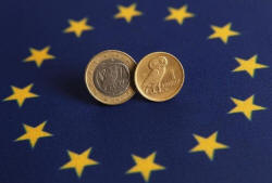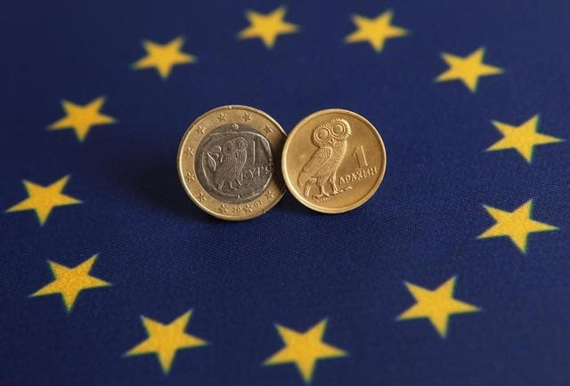 An one Euro (L) and one Greek Drachma coins are displayed on an European flag in this picture illustration taken in Istanbul June 14, 2012. REUTERS/Murad Sezer |