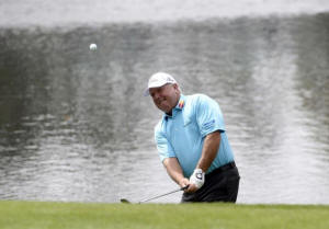 Mark O'Meara chips onto the 4th green during the Par 3 Contest prior