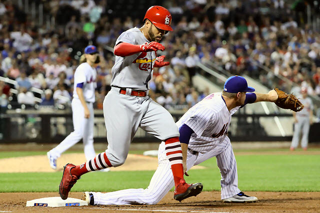 Cardinals left fielder Tommy Pham (28) steps to first on an infield