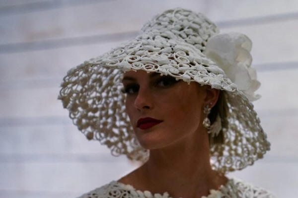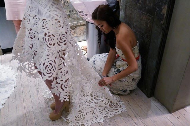 fixing a wedding dress made out of toilet paper before a fashion