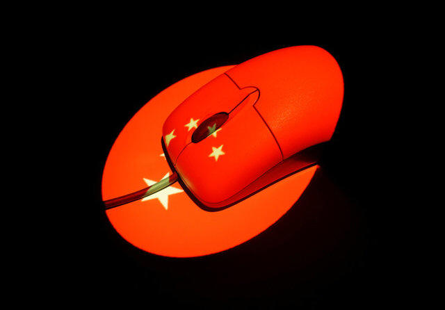 A computer mouse is illuminated by a projection of a Chinese flag in