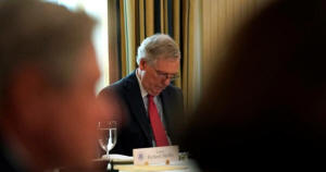 Senate Majority Leader Mitch McConnell looks down as President Trump speaks during a meeting with Senate Republicans to discuss healthcare at the White House. REUTERS/Kevin Lamarque |