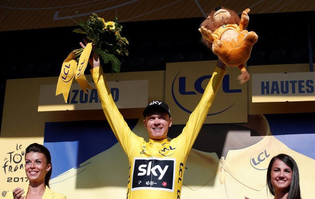 Team Sky rider Chris Froome of Britain celebrates on the podium,