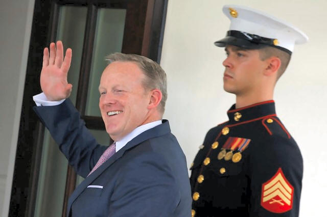 Outgoing White House Press Secretary Sean Spicer waves as he walks