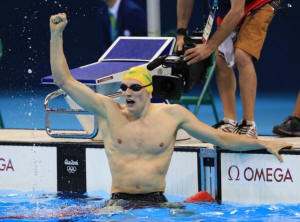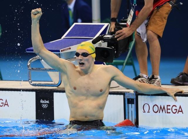 Brazil Mack Horton (AUS) of Australia reats after winning gold.