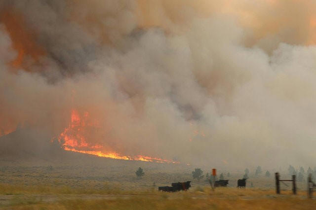 Cattle are seen near the flames of the Lodgepole Complex fire in