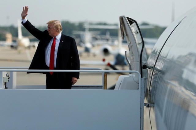 President Donald Trump boards Air Force One for travel to Naval